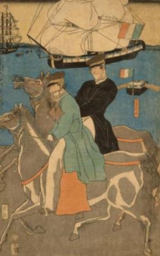 French men taking horse ride on Sunday in Yokohama (Yokohama kyujitsu Furansujin uma yuko), 1861
